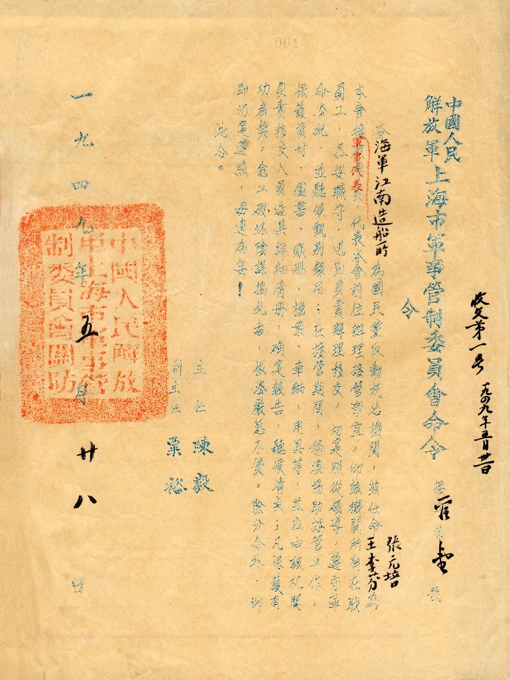 1949年5月上海,1949年5月28日,中國人民解放軍上海市軍事管制委員會發布第一號“軍管令”,即接管海軍江南造船所。