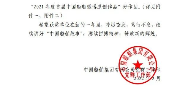 為鼓勵更多成員單位積極加入到中國船舶集團(tuán)新媒體平臺的宣傳中來,在集團(tuán)公司黨群工作部的指導(dǎo)下,中國船舶報社從不同維度,對2021年度各單位支持“中國船舶”微信的力度進(jìn)行了梳理統(tǒng)計,并利用微博政務(wù)的全國專家?guī)煸u審資源,對2021年度“中國船舶”微博原創(chuàng)作品進(jìn)行了專業(yè)評審,評選結(jié)果公布如下: