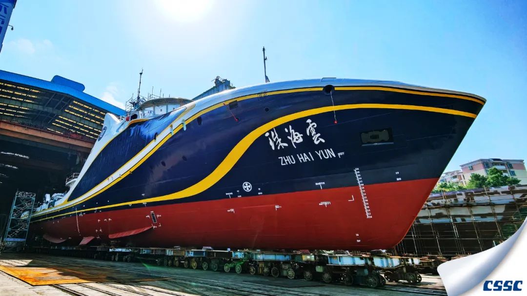 黃埔文沖建造的全球首艘智能型無(wú)人系統(tǒng)科考船“珠海云”號(hào)下水。這科幻的外表又似一頭巨大的鯨魚躍出海面。