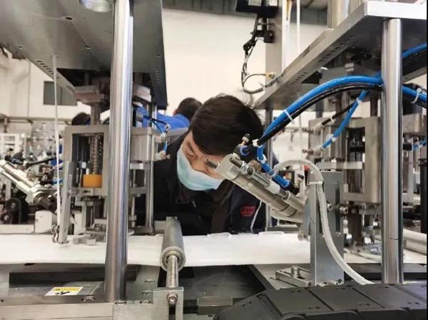 ????就在幾天前,鵬力智造已交付首批口罩機及防護服壓條機。此次交付的N95口罩機由鼻梁焊接機、打片機、耳帶焊接機三部分構成,可生產多種類型折疊口罩,單臺設備每分鐘最高生產60只口罩。