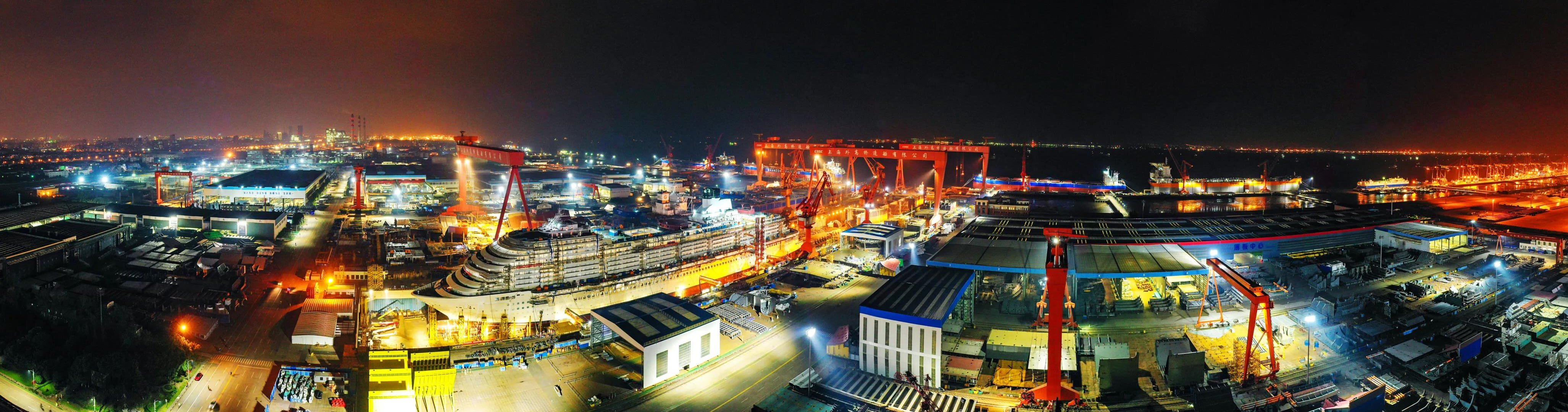 十月金秋結碩果,外高橋造船提前兩個半月完成了2021年度交船19艘/座的生產(chǎn)任務,燈火通明的廠區(qū)超廣角視圖充分體現(xiàn)了外高橋造船人持續(xù)保障大型郵輪項目高效運行,努力完成民船、海工、郵輪產(chǎn)品的設計建造任務、爭取以超額完成全年目標的決心和信心。