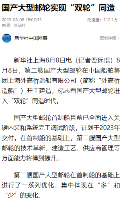8月8日,第二艘國產大型郵輪在中國船舶集團旗下外高橋造船開建,這標志著中國船舶工業已初步掌握大型郵輪設計建造關鍵核心技術。